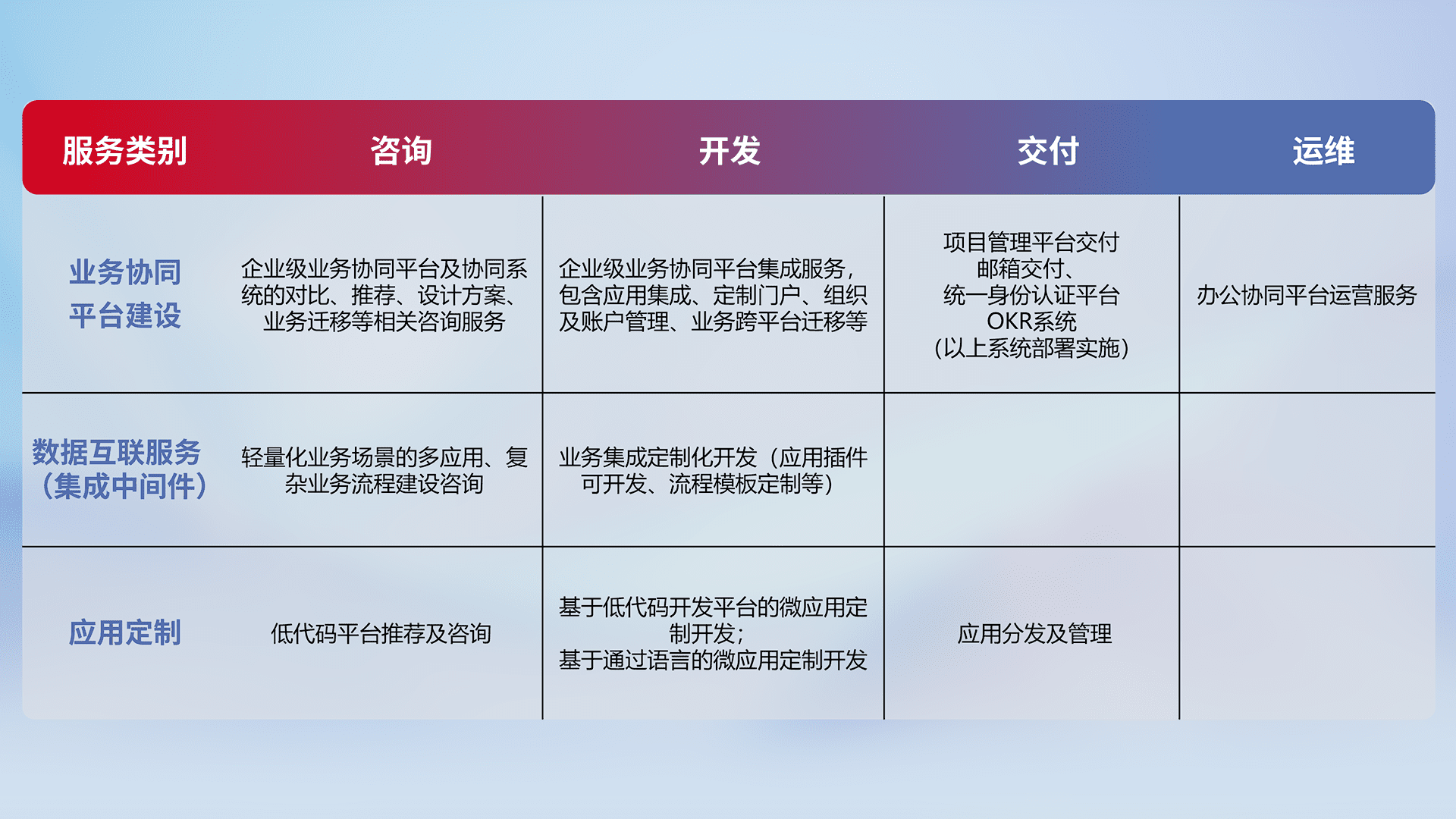 针对钉钉、、、、企微、、IDaas等平台级产品提供产品的规划、、方案、、、交付、、、、定制化开发等服务,,实现如统一协同办公、、智能客户服务、、混合会议管理、、、智能数据查询、、、等业务场景,,实现数字化转型。。。