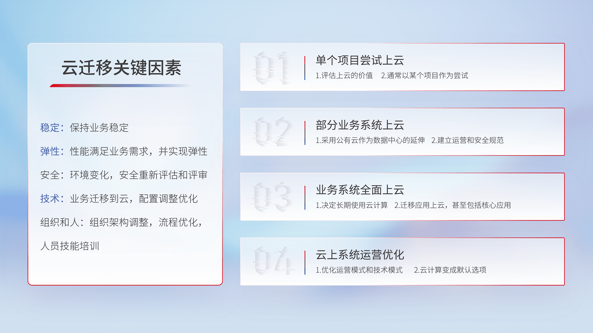 结合实际业务,,从规划设计、、、云平台选型、、云原生改造、、、数据迁移、、、、集成交付,,迁移全过程为客户识别最佳上云路径,,,,做好风险识别管理,,,设计网络架构、、身份权限、、安全审计合规、、、、操作审计、、、日志审计、、、、监控告警策略、、、多站点容灾设计等,,,对云上基础设施进行整体规划,,提升IT治理水平,,以满足弹性、、、高可用、、、高性能的需求。。。
