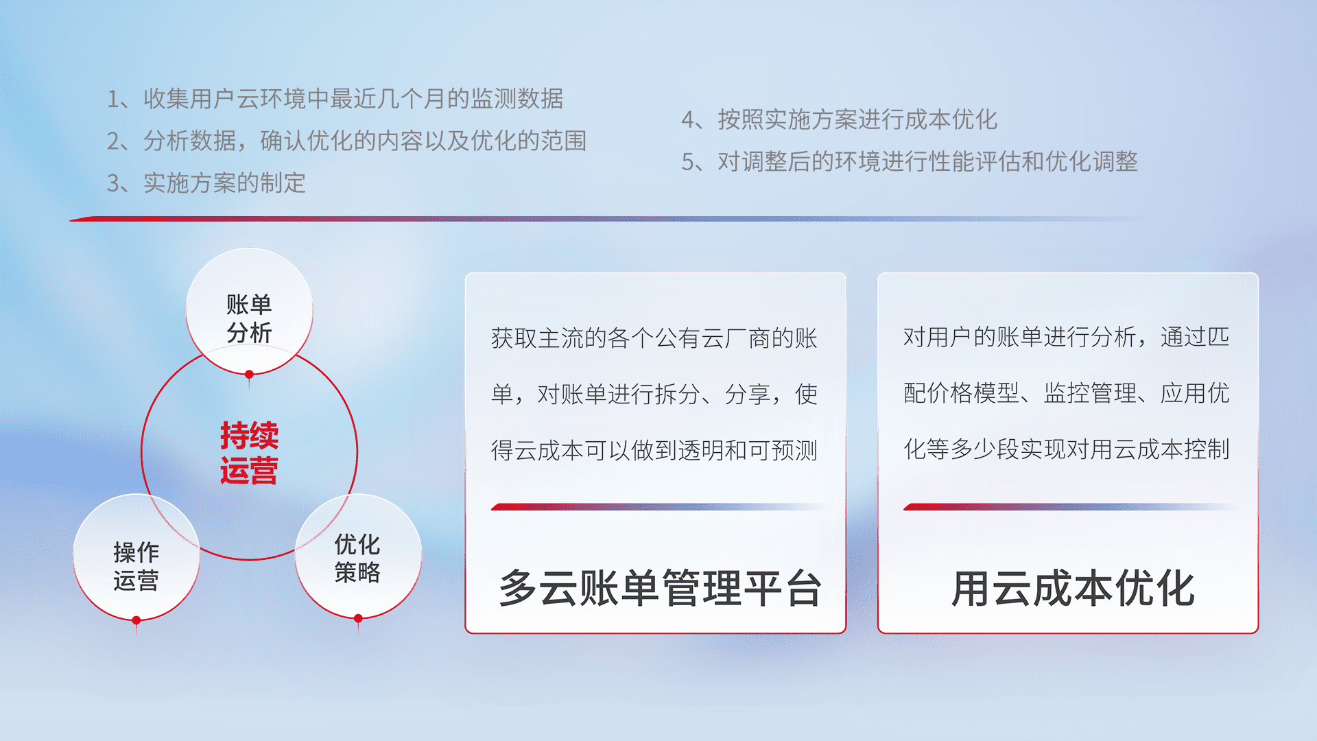 通过多云纳管,,,以统一的资源数据模型把客户的云资源进行抽象和封装,,,,进而实现对多云资源的统一操作,,,,保障云资源管理的可靠性、、、、稳定性与可用性。。。量身定制化运维内容,,,配置、、、开发运维、、、补丁管理、、备份、、、监控、、、认证和访问管理、、、审计和日常巡检等,,保障在用云过程中的可靠度,,,稳定度以及高可用率。。。。